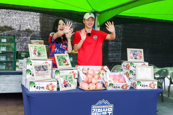 | 김천상무프로축구단이 선수단이 직접 수확한 김천 특산물 복숭아 라이브커머스를 실시했다.