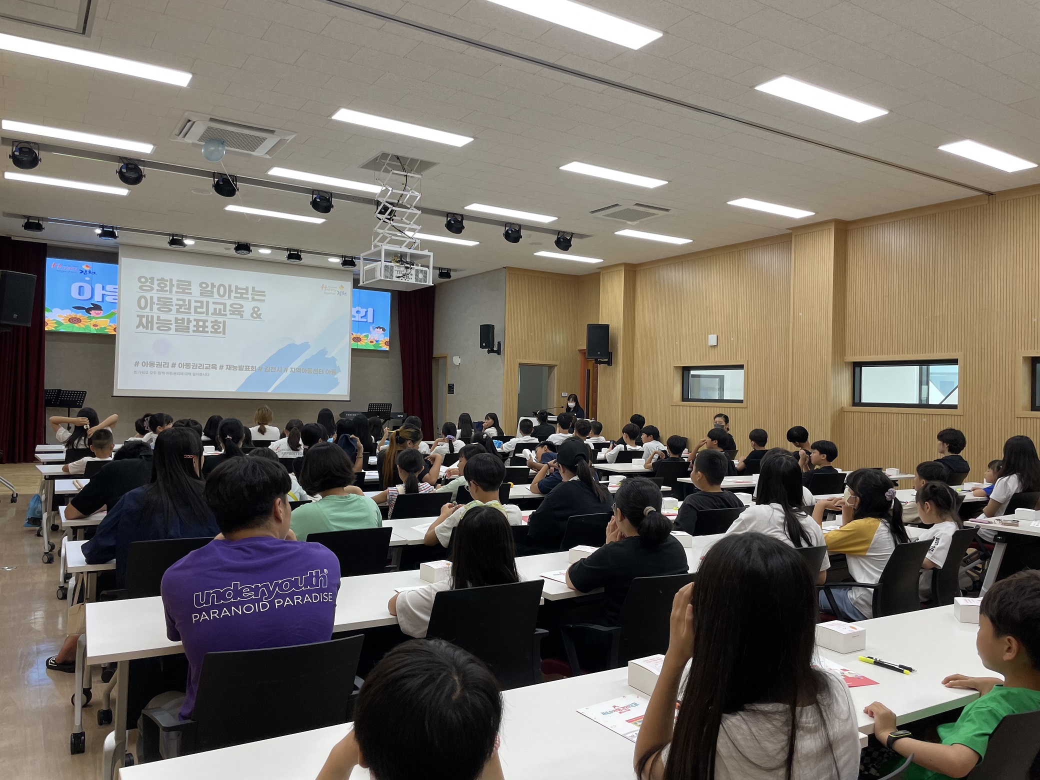 | 김천시(시장 김충섭)는 8월 17일 청소년문화의집 대강당에서 김천시 지역아동센터 이용 아동과 관계자 100여 명을 대상으로 아동 권리교육을 실시했다. 이번 아동 권리교육은 아동의 눈높이에 맞게 체험과 참여를 할 수 있도록 4대 아동 권리 중 1부에서는 영화를 통해 ‘참여권’을, 2부에서는 재능 발표회를 통해 ‘발달권’을 집중적으로 학습해볼 수 있도록 마련했다.