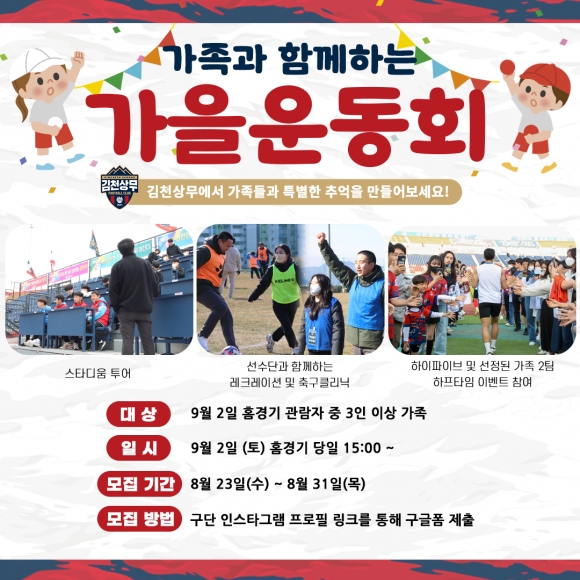 김천상무프로축구단이 9월 23일부터 31일까지 ‘2023 가족과 함께하는 가을운동회’에 참가할 팬을 모집한다. 가을운동회는 9월 2일 충북청주전 홈경기 시 진행한다. 2일 3시부터 김천종합운동장 및 보조구장에서 실시할 예정이다. 모집 인원은 가족 단위이며 3인 이상 20가족을 모집한다. 참가신청은 구글 폼(https://forms.gle/UaMsTJwHcXViypkd6 )을 통해 가능하다.