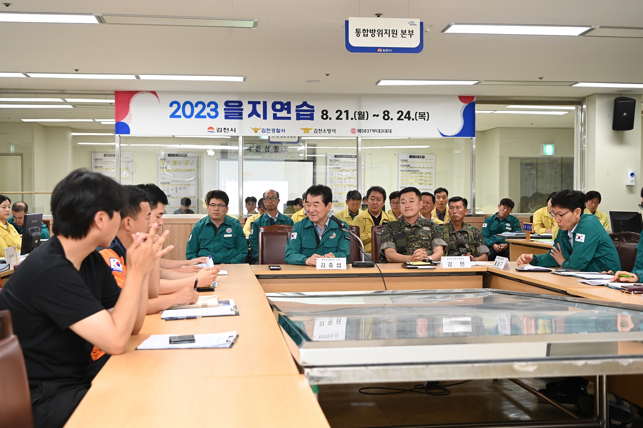 | 김천시(시장 김충섭)는 8월 22일 15시 김천시청 지하 종합상황실에서 ‘2023년 을지연습 전시 주요 현안 과제 토의’를 진행했다.
