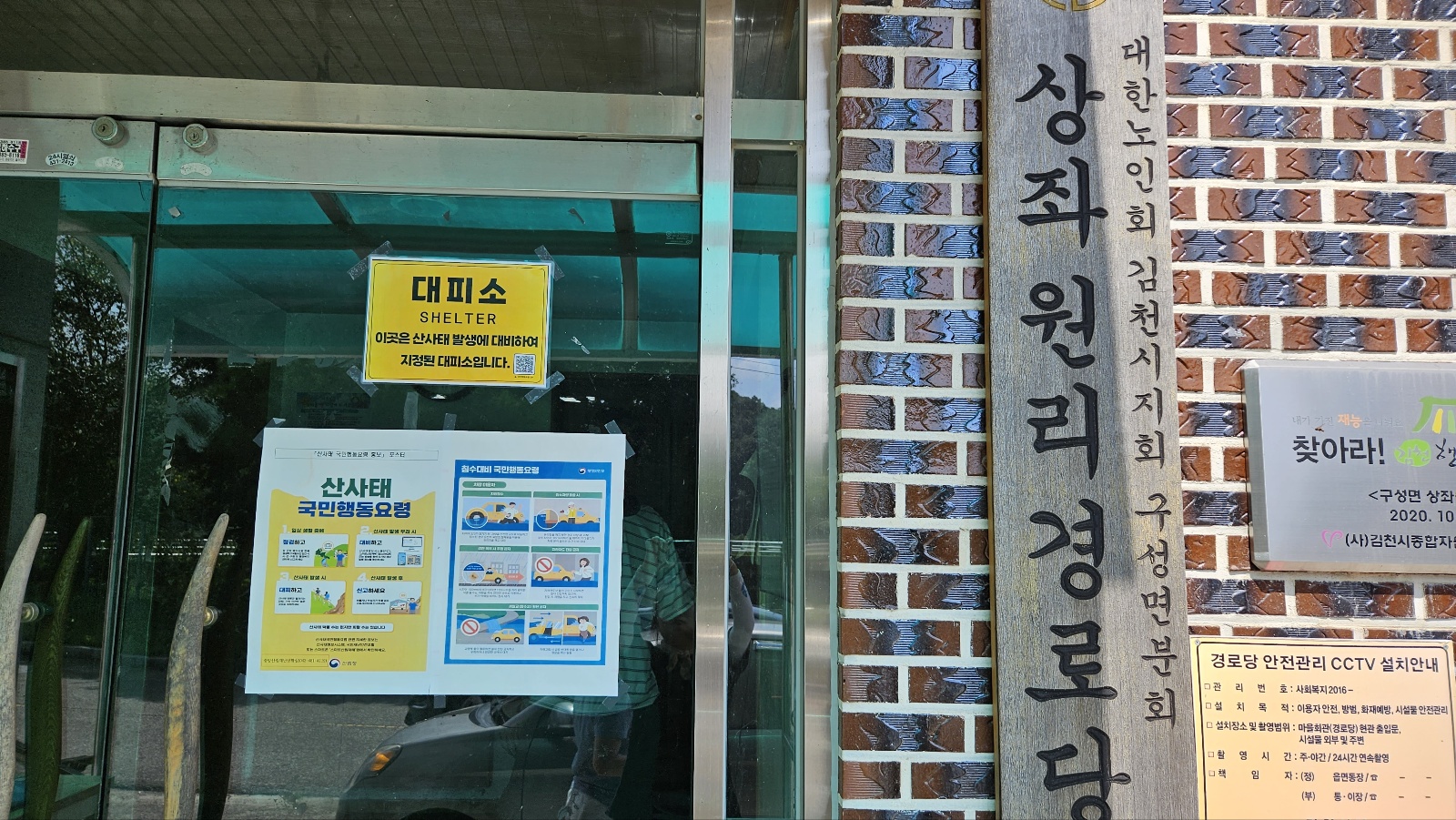| 김천시 구성면(면장 김동진)에서는 지난 8월 21일부터 25일까지 산사태 발생 시 신속한 대피 및 안내를 위해 산사태 취약지역 대피소 안내표지판을 게시했다.