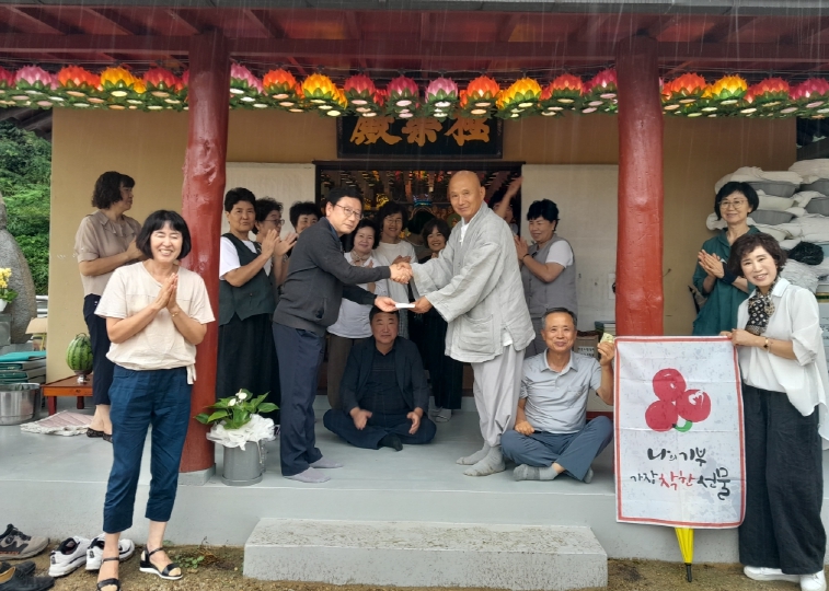 | 김천시 아포읍(읍장 김현인)은 지난 8월 30일, 봉산리 소재 삼일암(주지 도현)에서 백중을 맞아 이웃돕기 성금 210만 원과 백미 10kg 50포, 수건 250장, 양말 250켤레 등 총 500만 원 상당의 성금·품을 전달받았다.