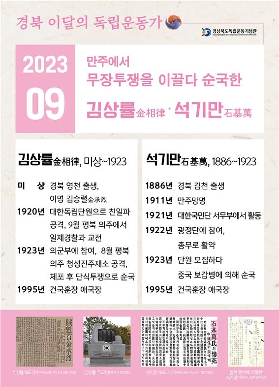 |  | | | ⓒ 김천내일신문 | | 경상북도독립운동기념관(관장 한희원)은 영천의 김상률 선생과 김천의 석기만 선생을 2023년 경북 9월의 독립운동가로 선정하고, 공훈을 기리는 포스터를 도내에 배부했다.