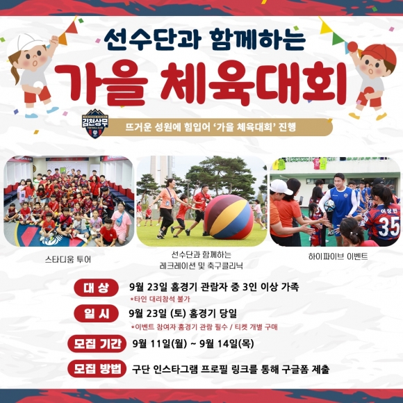| 김천상무가 9월 23일 ‘제2회 선수단과 함께하는 가을체육대회’ 참가자를 모집한다.