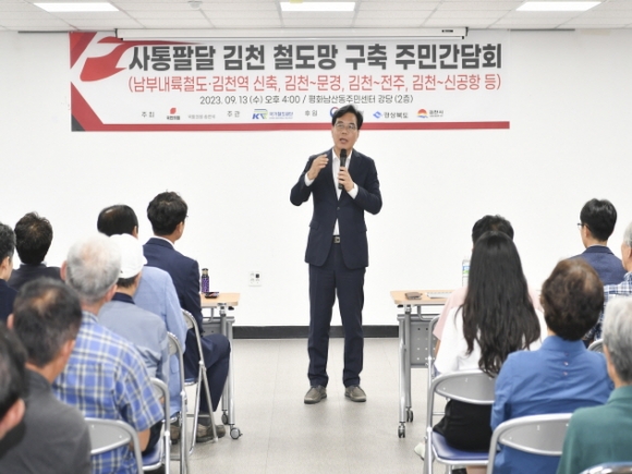 |  | | | ⓒ 김천내일신문 | | 송언석 국회의원(국민의힘, 경북 김천)이 9월13일 김천시 평화남산동주민센터 강당(2층)에서 개최한 「사통팔달 김천 철도망 구축 주민간담회」를 성황리에 마무리했다고 밝혔다.