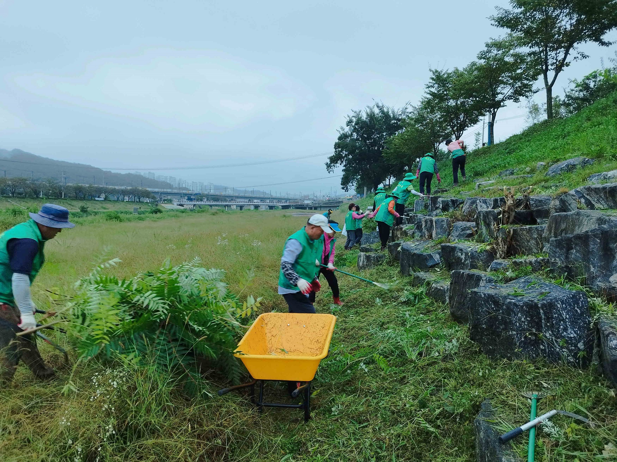 이날 회원들은 작업에 앞서 안전사고 예방 교육을 한 후, 3개 조로 나누어 김천IC 입구~교동교를 중심으로 900m 구간의 직지천 도로변에 자라난 잡초와 넝쿨을 제거하고 생활 쓰레기와 각종 부산물 수거도 병행하는 등 도로 환경을 개선하고 깨끗한 수변 환경을 조성하기 위해 구슬땀을 흘렸다.