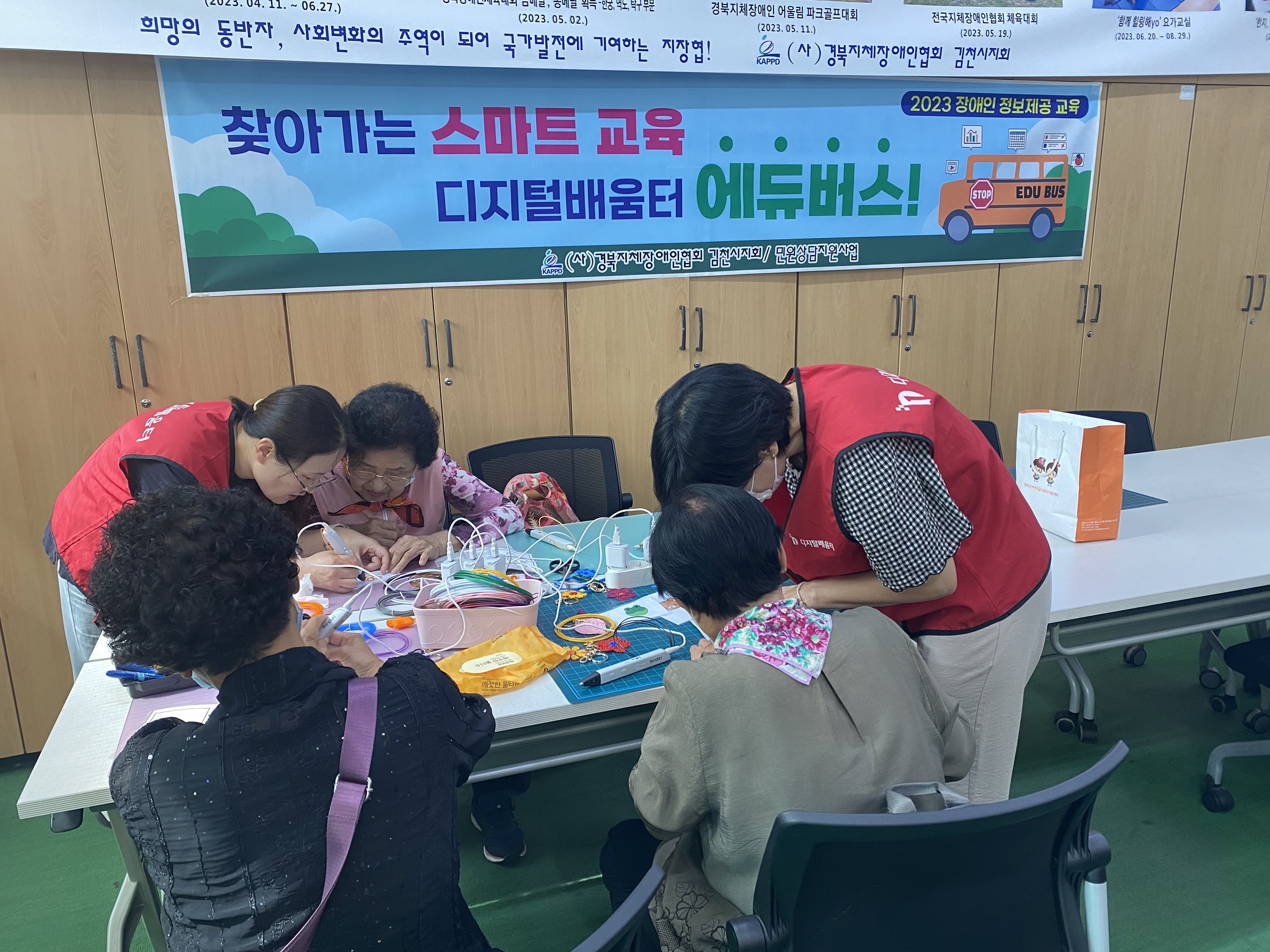 | 김천시에서는 9월 12일, 19일 경북지체장애인협회 김천시지회에서 찾아가는 디지털 배움터, 에듀버스를 운영했다. 양일간 강좌에서는 MBTI 기반 잠재 능력테스트 인지 게임, 스마트폰 교육, VR 체험, 3D 펜 체험, 키오스크 체험 등 다양한 디지털 관련 교육에 40여 명의 회원들이 참가했다.