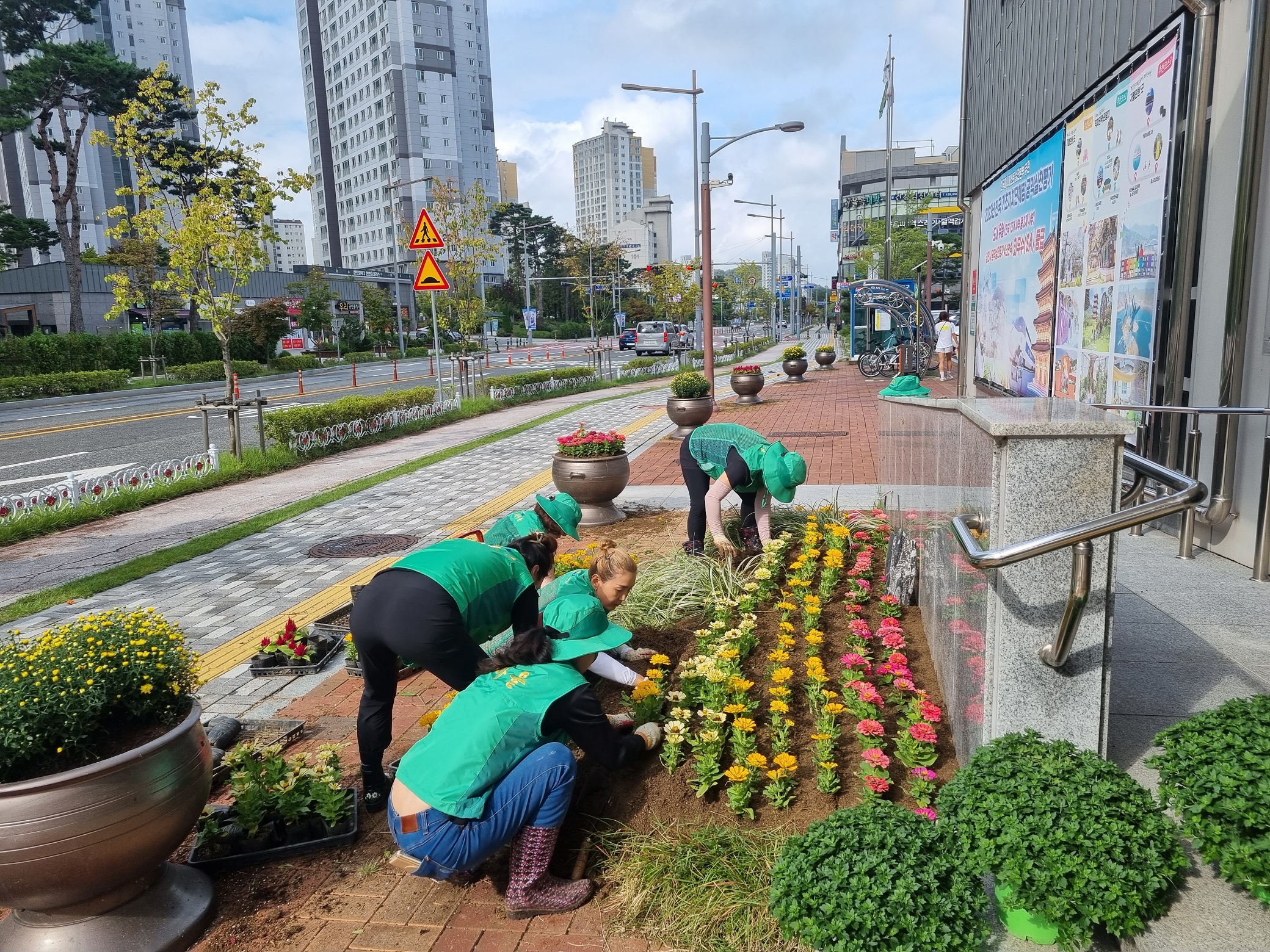 새마을지도자협의회 회원들은 국화꽃을 중심으로 노란색과 주황색 마리골드 2,000본을 안산공원 입구에 있는 『Happy together 정원』과 율곡동 행정복지센터 정문에 심어 한 발짝 가을이 찾아온 율곡동에 어울리는 분위기를 선사했다.
