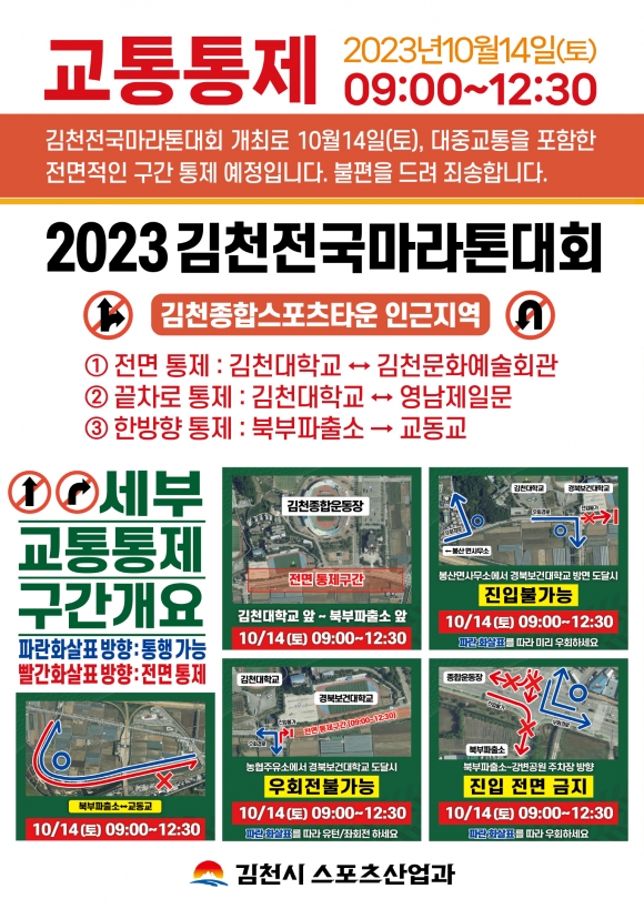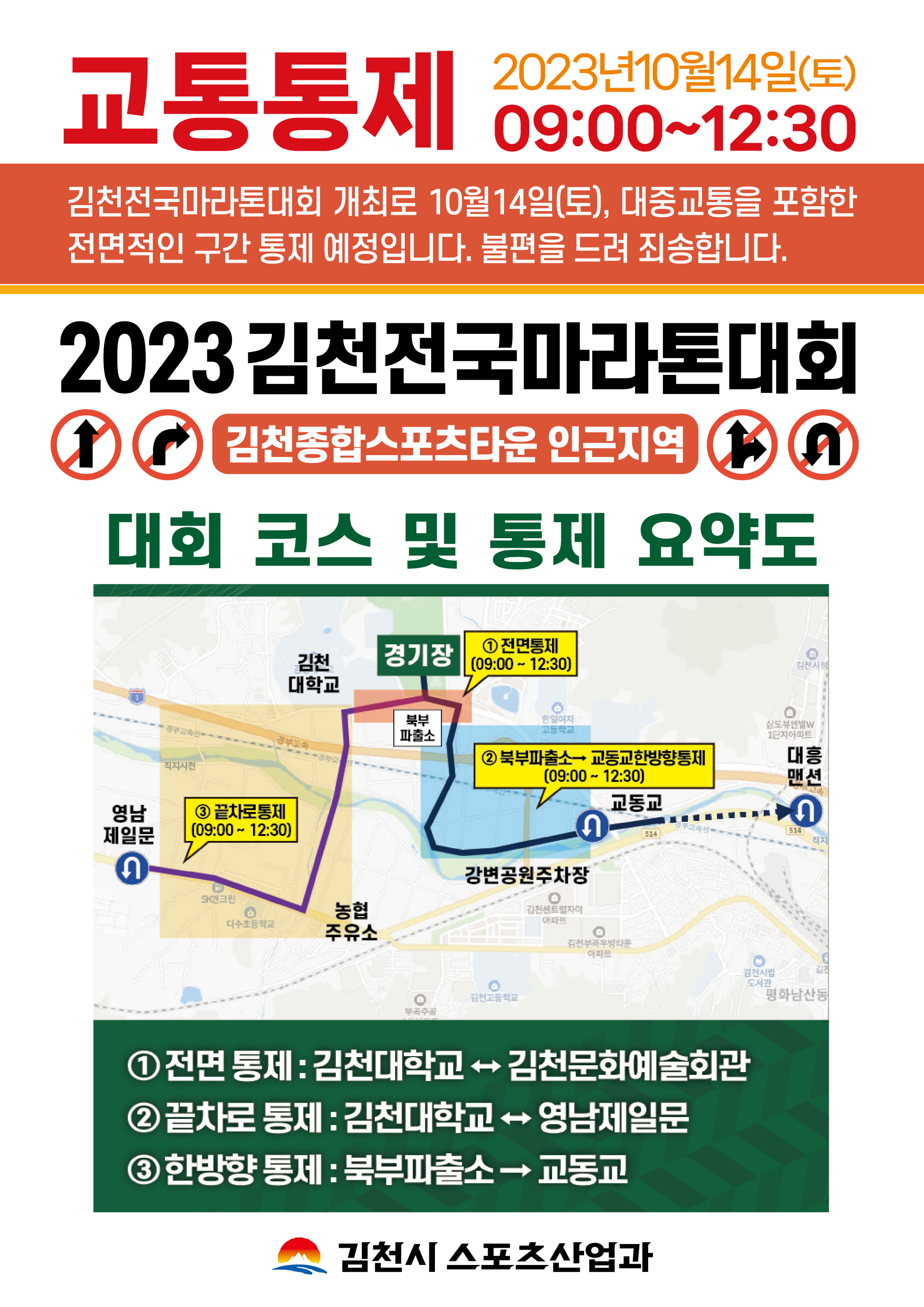 | 김천시에서 오는 10월 14일 김천전국마라톤대회 개최와 관련, 대중교통을 포함한 전면통제를 실시한다. 김천전국마라톤 대회는 김천종합운동장에서 하프코스(오전 9시 30분 출발), 10km(오전 9시 40분 출발), 5km(오전 9시 50분 출발) 3종목 2,000여명의 선수들이 경기를 참가한다.