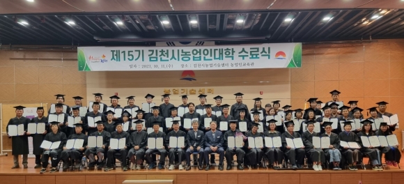 | 김천시는 지난 10월 11일, 2023년도 김천시 농업인대학 샤인머스켓 과정 76명의 수료생을 대상으로 농업기술센터 대강당에서 수료식을 개최하였다.