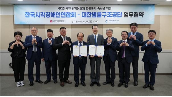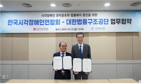 | 대한법률구조공단(이사장 이종엽)은 10월 13일 한국시각장애인연합회(회장 김영 일)와 시각장애인의 법률복지 증진 및 맞춤형 법률구조 서비스 제공을 위한 업무협약(MOU)을 체결했다고 이날 밝혔다.