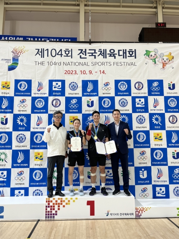 | 김천시청 배드민턴단은 지난 10월 9일부터 14일까지 6일간 전남 화순군 하나움문화스포츠센터에서 사전경기로 펼쳐진 「제104회 전국체육대회 배드민턴 경기」에서 여자단체전과 혼합복식을 포함해 금 2, 은 1, 동 1의 성적을 올렸다.