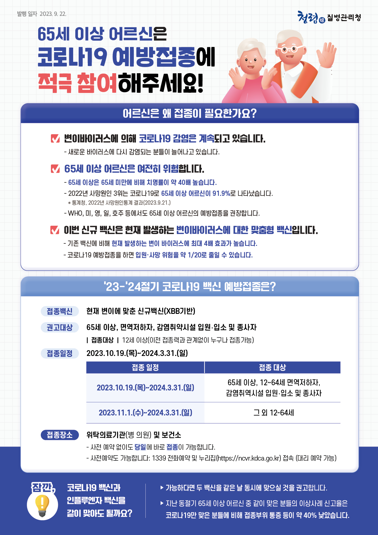 | 경상북도는 코로나19 유행에 대비해 10월 19일부터 고위험군인 65세 이상 어르신, 면역저하자, 감염취약시설 구성원을 대상으로 코로나19 예방접종을 실시한다.