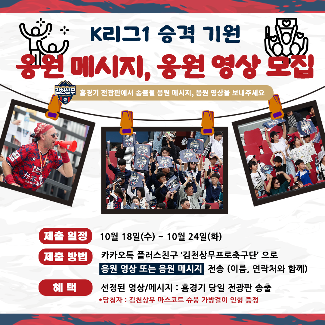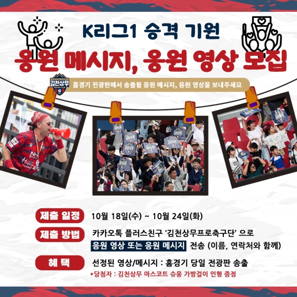 | 김천상무가 10월 29일 승격 기원 홈경기를 맞아 승격 기원 응원 메시지, 영상 참여자를 모집한다.