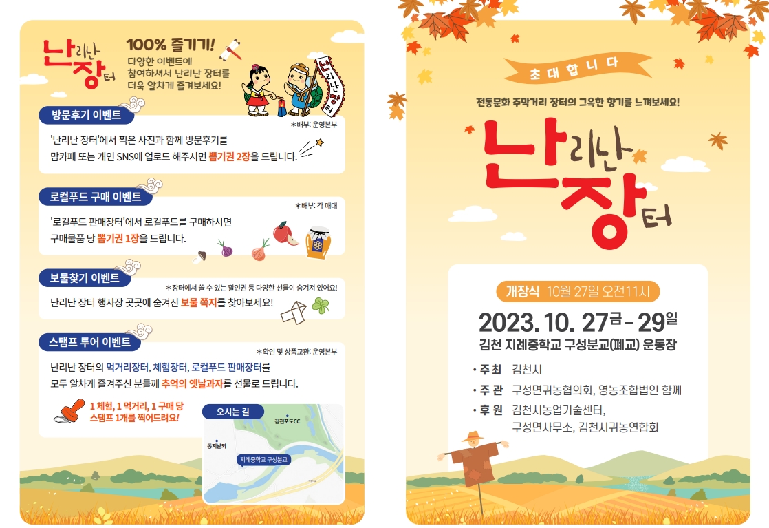 | 김천시는 제3회를 맞이하는 난리 난 장터를 오는 10월 27일부터 29일까지 3일간 폐교 부지인 지례중학교 구성분교 운동장에서 구성면 귀농협의회 주관으로 개최한다.