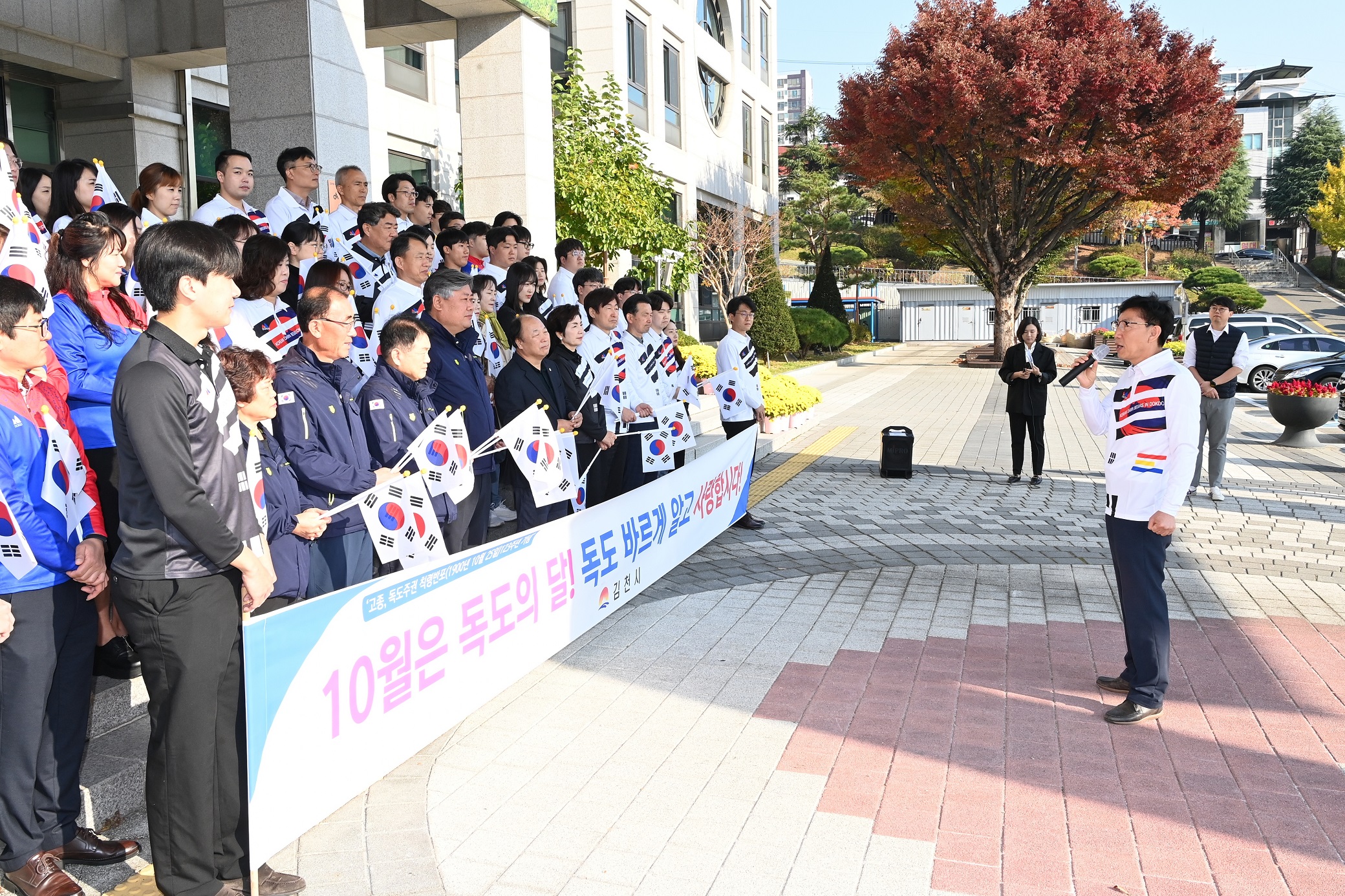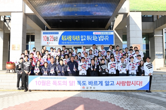 ‘10월은 독도의 달! 독도 바르게 알고 사랑합시다!’라는 주제로 열린 이번 행사에는 직원과 독도 사랑 국민연합 회원 등 100여 명이 참석했다. 독도의 날은 1900년 10월 25일 대한제국의 고종황제가 독도를 울릉도에 편입시키는 칙령 제41호를 반포한 날을 기념하는 날로 김천시에서는 독도에 대한 국민적 관심을 높이기 위해 매년 「독도 사랑 티셔츠 입기」 운동(캠페인)에 동참하고 있다.
