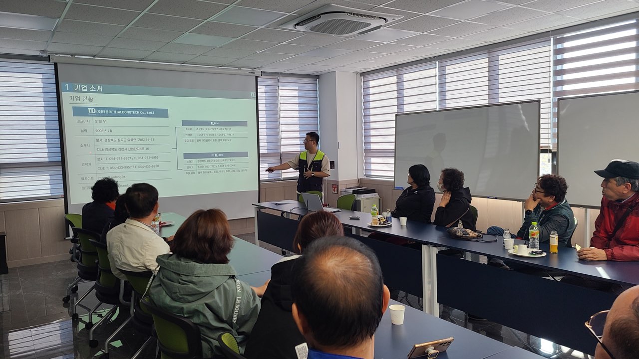 견학에 참여한 이통장은 (주)태동테크 김천공장의 생산공장 시스템을 둘러보며 기업 현황 및 구인 상황을 청취했다. 잘 정비된 물류와 생산 현장에 크게 호평하며 중소기업에 대한 이해와 인식 제고의 시간을 가졌다.