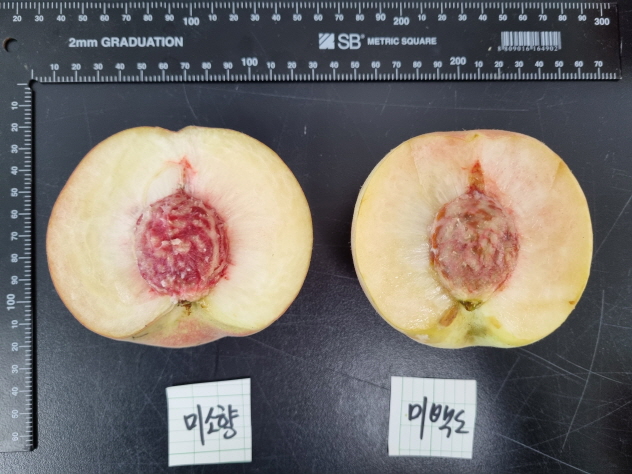 이 시기 수확되는 대표적인 고당도 복숭아 품종인‘미백도’품종이 있으나 과실의 무른 특성 때문에 재배와 유통에 어려움을 겪어 왔다.