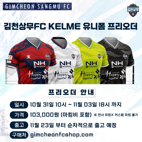 김천상무프로축구단이 31일 오전 10시부터 11월 3일 오후 6시까지 구단 공식 온라인 샵을 통해 2023 마지막 유니폼 프리오더를 실시한다. 이번 프리오더는 유니폼 판매 관련 팬들의 의견을 반영해 추가 진행하게 됐다. 구단 창단 최초로 프리오더에 어린이 사이즈가 포함된다.