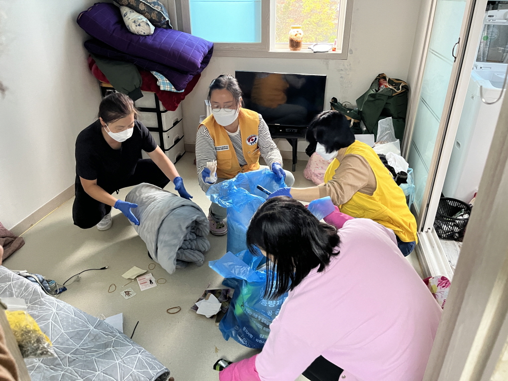 적십자봉사회 회원들은 집안 내부에 방치된 쓰레기 처리, 곰팡이 등으로 오염된 물건 수거, 생활용품 정리 정돈 등 쾌적한 주거환경을 제공하는 데 온갖 힘을 쏟았다.