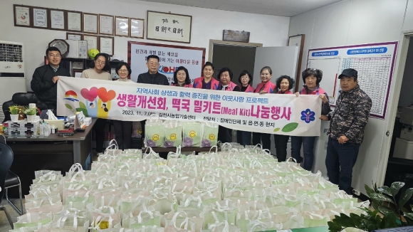 | 한국생활개선 김천시연합회(회장 임소록)는 지난 11월 7일, 농업기술센터 생활교육관에서 회원 27명이 모여 『행복한 농촌 가정육성 프로젝트 떡국 밀키트(Meal Kit) 만들기 및 나눔 행사』를 시행했다.