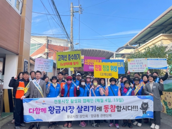 이 운동은 9월부터 시작한 ‘황금시장 살리기’ 장기계획으로 4번째 운동이다. 이날 참여한 회원들은 5대 핵심 실천 과제인 고객선 준수하기, 원산지와 가격표시, 소방도로 확보, 상인조직 활성화, 친절·위생·청결한 황금시장 만들기 등의 내용을 담은 홍보 피켓과 어깨띠를 두르고 전통시장 살리기에 목소리를 높였다.