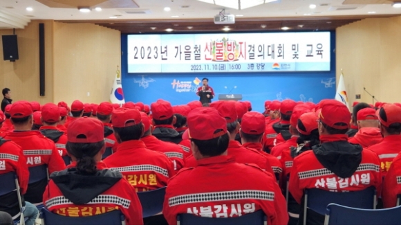|  | | | ⓒ 김천내일신문 | | 김천시는 가을철 산불 조심 기간(11월 1일~12월 31일)이 도래함에 따라 지난 11월 10일 시청 3층 강당에서 산불감시원, 산불 전문 예방진화대, 공무원 등 240여 명이 참석한 가운데 산불방지 활동에 총력을 다할 것을 다짐하는 ‘2023년 가을철 산불방지 결의대회 및 교육’을 시행하여 본격적인 산불방지 비상 체제로 돌입했다.