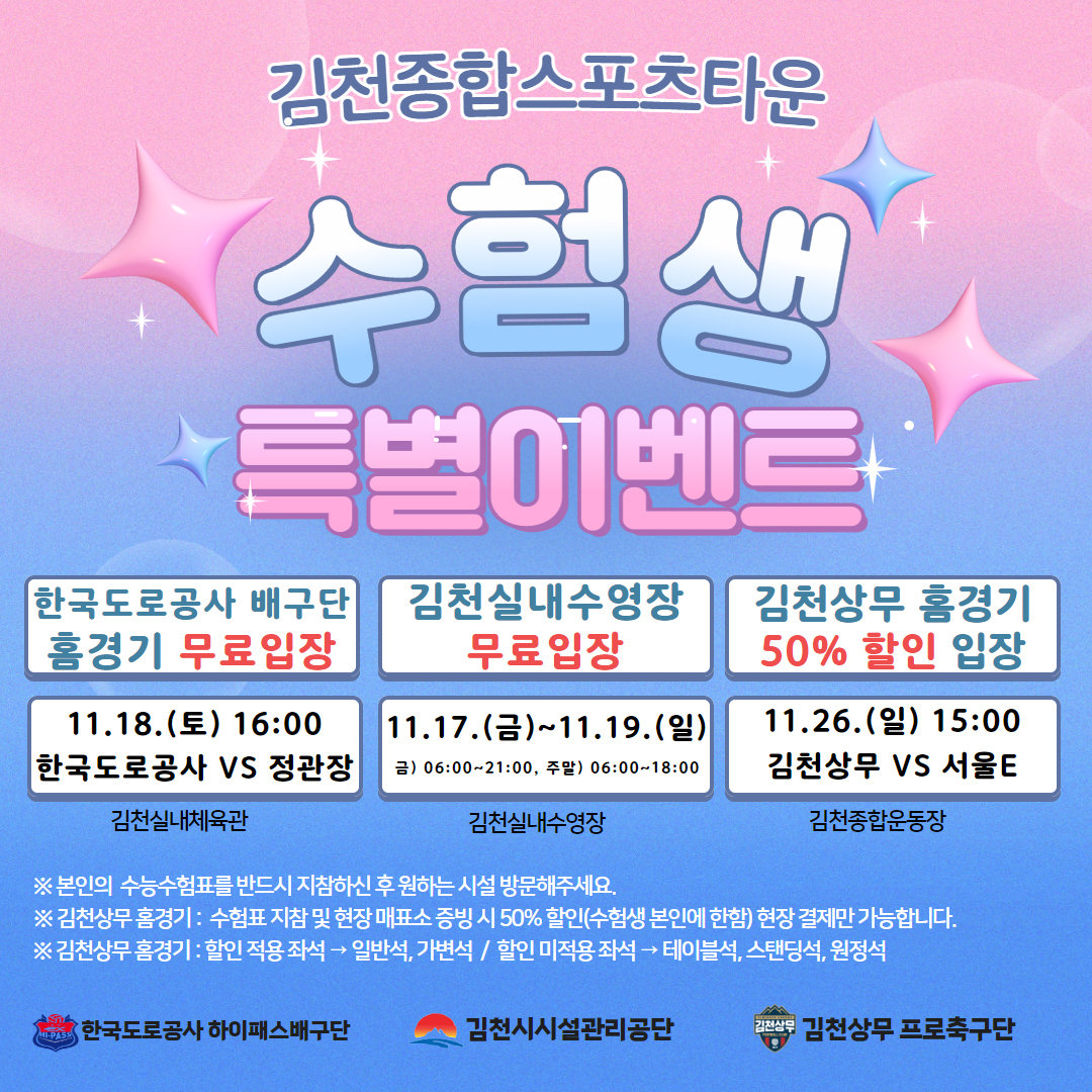 주요 이벤트 내용은 수험생 대상 시설 무료입장 또는 할인 입장이다. 우선 김천시시설관리공단은 11월 17일부터 19일까지 수험생에게 김천실내수영장을 무료개방한다. 한국도로공사 하이패스 배구단은 11월 18일(토)에 김천실내체육관에서 진행되는 홈경기(한국도로공사 VS 정관장) 무료입장을 준비했다. 마지막으로 김천상무프로축구단은 11월 26일(일) 홈경기(김천상무 VS 서울E) 일부 좌석 50%할인 입장을 마련했다.