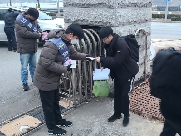 | 김천상무프로축구단이 11월 16일 오전 7시부터 관내 수능 고사장에서 2024학년도 대학수학능력시험을 치르는 수험생 응원 행사를 진행했다. 수능 응원에는 김천상무 전 직원이 참여해 핫팩을 전달했다. 김천시 내 수능고사장인 김천고, 김천중앙고, 김천여고, 한일여고 앞에서 사무국 직원들은 수험생들에게 핫팩과 함께 따뜻한 응원의 말을 건넸다.