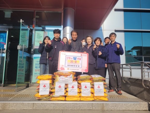| 정문겸 자산동 영농회장과 자 정정화씨는 11월 15일 취약계층을 위해 백미 10kg 30포를 자산동 행정복지센터에 기부했다.