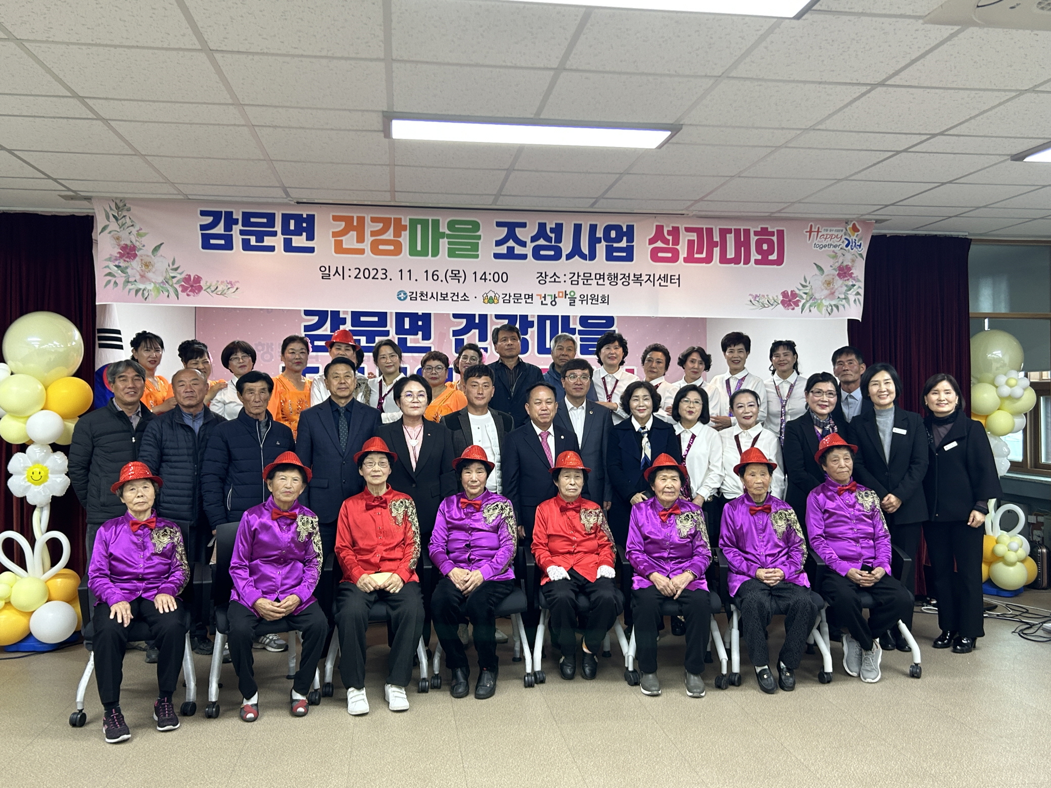 | 김천시 보건소는 지난 11월 16일 감문면 행정복지센터에서 2023년 감문면 건강마을 조성 사업 성과대회를 했다. 건강위원들을 비롯한 주민 등 120여 명이 참석한 가운데 한 해 동안 이룬 성과를 유감없이 발휘하는 화합의 장을 마련했다.