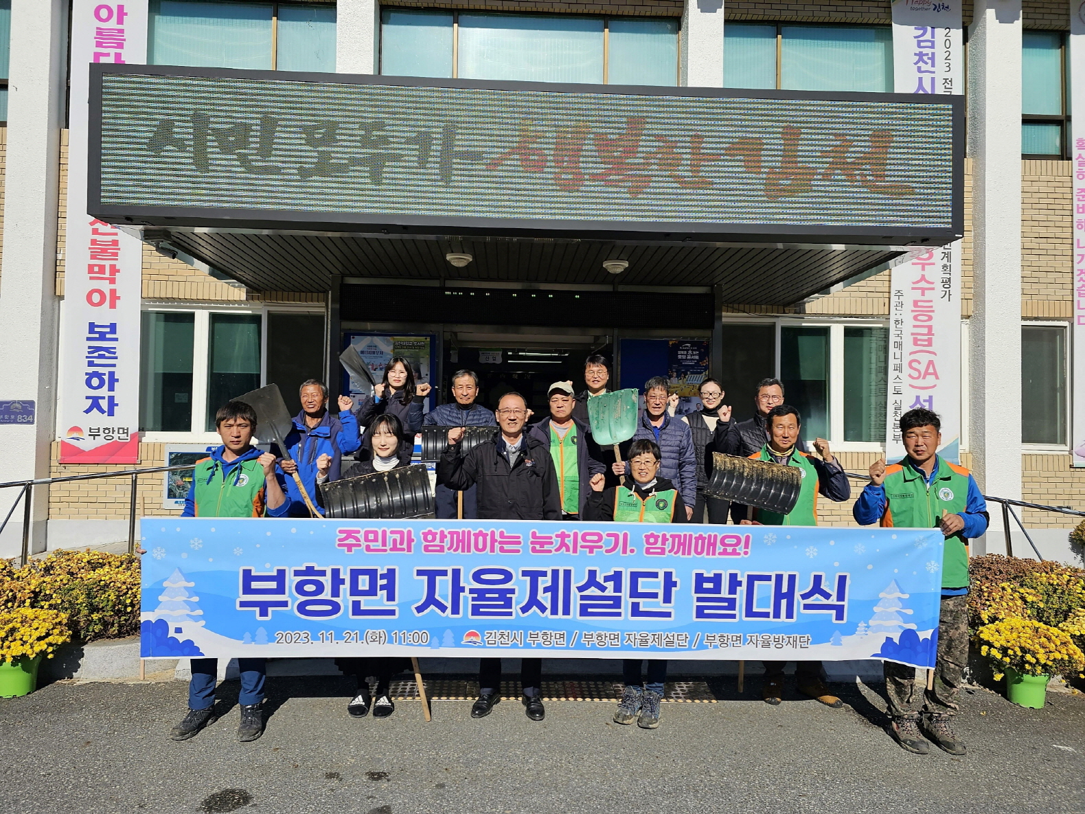 | 김천시 부항면(부면장 박세환)은 겨울철 강설 및 도로결빙에 따른 도로 안전사고 위험이 커짐에 따라 자율제설단, 자율방재단원 외 관계자 20여 명이 참석한 가운데 자율제설단 발대식과 안전교육을 시행하여 겨울철 도로 안전사고 제로(ZERO) 달성을 위한 첫 발걸음을 내디뎠다.
