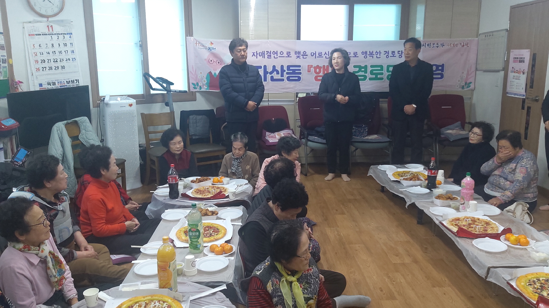 이날은 성큼 다가온 추위에 대비하여 어르신들이 조금이나마 든든하게 겨울을 나실 수 있도록 자산동 청년협의회 회원 20여 명이 경로당에 방문해 따뜻한 치킨과 피자 등 간식을 대접하고 담화를 나누었다.