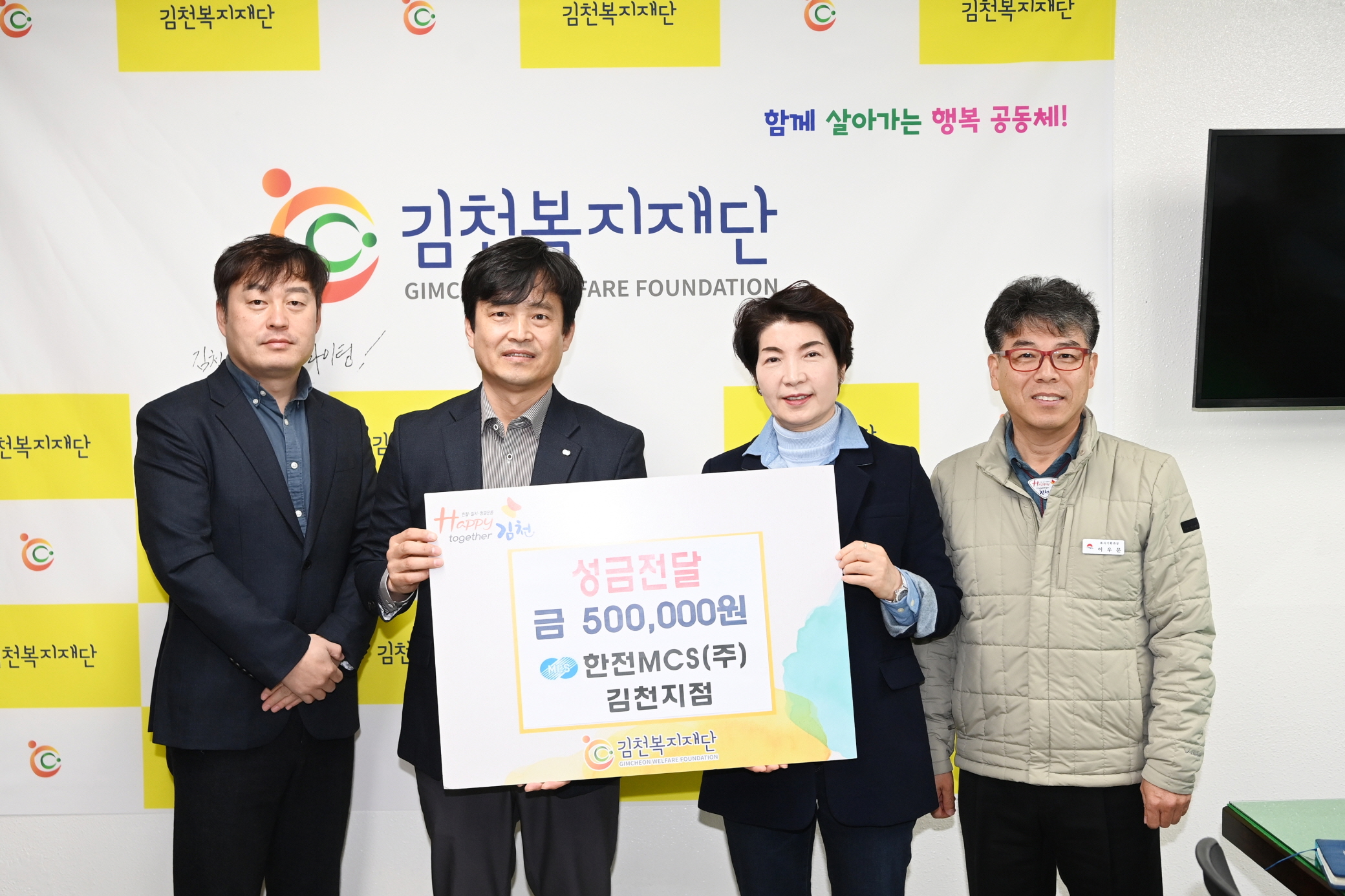 | 김천복지재단은 11월 24일 한전 MCS(주) 김천지점(지점장 김현수)으로부터 이웃돕기 성금 50만 원을 전달받았다고 밝혔다.