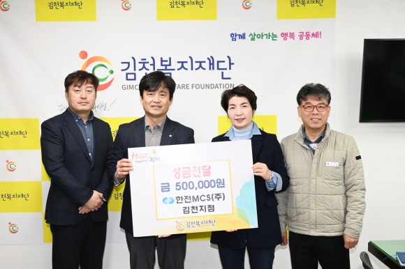 김경희 김천복지재단 이사는 “한전 MCS(주) 김천지점의 따뜻한 나눔 활동을 통해 온정이 느껴지는 지역사회가 되는 것 같다.”라며 “전달해 주신 성금은 복지정책의 사각지대에 놓인 이웃들이 행복하게 살아갈 수 있도록 소중히 잘 사용하겠다.”라고 말했다.