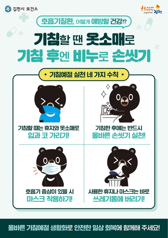 윤현숙 김천시 보건소장은 “이번 호흡기 감염병 복합유행은 당분간 이어질 것으로 예상된다”라며 “호흡기 감염병 예방을 위해서는 손 씻기, 기침 예절, 마스크 착용, 백신 접종 등 개인 방역 수칙 준수와 정확한 진단과 치료가 무엇보다 중요하다”라고 강조했다. |
