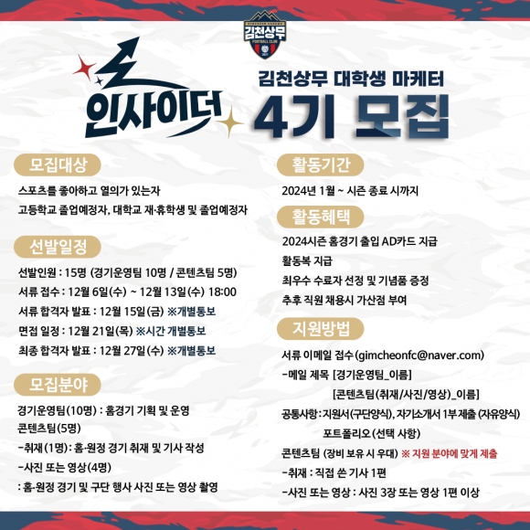 모집 기간은 12월 6일부터 13일 오후 6시까지다. 경기운영팀, 콘텐츠 팀으로 나눠 모집하며 공통적으로 지원서(구단 양식)와 자기소개서(자유 양식)를 제출해야 한다. 콘텐츠 팀의 경우 지원 분야에 맞게 기사 1편, 사진 3장, 영상 1편을 추가 제출해야 한다. 서류 접수는 구단 공식 이메일(gimcheonfc@naver.com)로 가능하다.