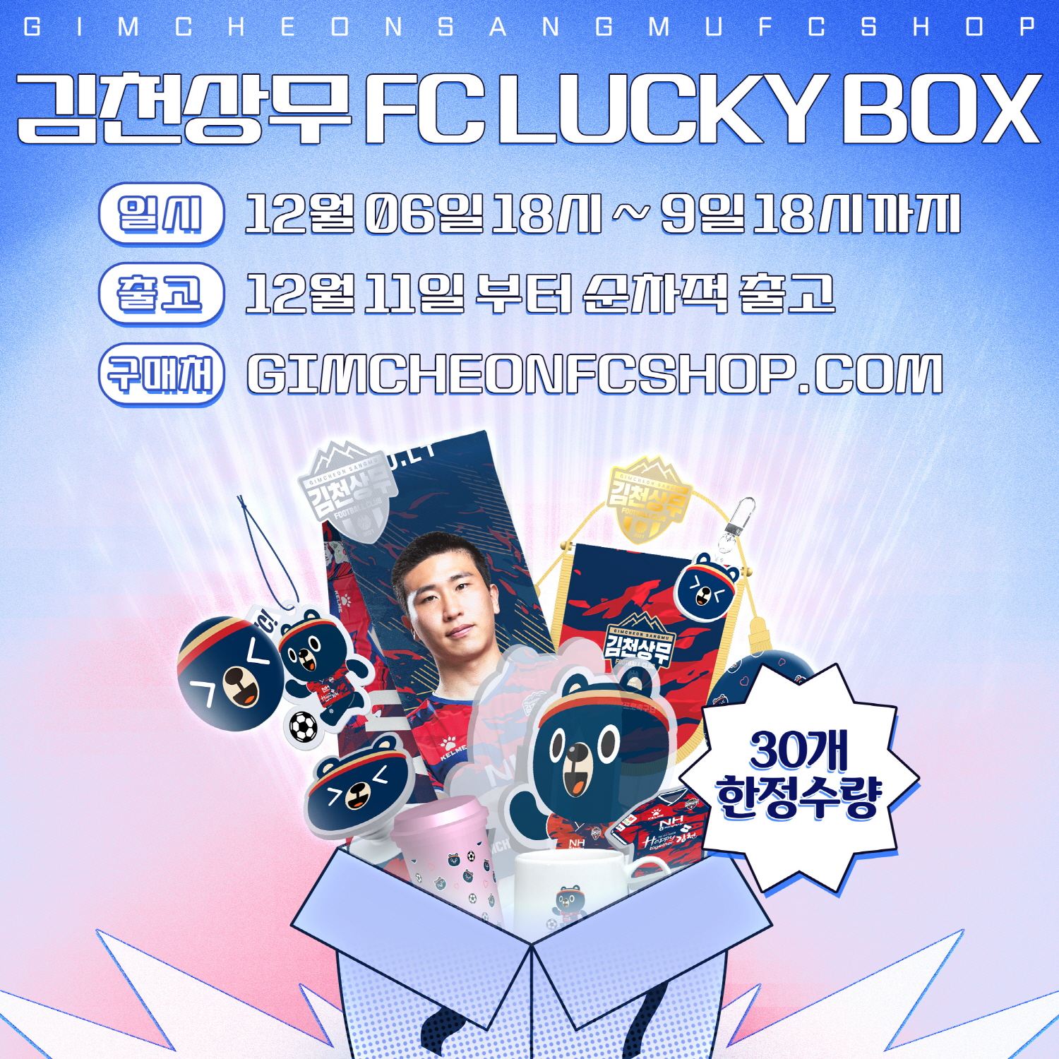 김천상무 럭키박스 또한 6일 오후 6시부터 9일 오후 6시까지 구단 공식 온라인 샵을 통해 판매한다. 럭키박스는 30개 한정판매로 진행된다. 2023시즌 선수 응원타올, 리유저블 텀블러, 슈웅 그립톡 등 구단 공식 온라인 샵 내 MD 품목으로 구성됐다. 단, 의류와 머플러는 제외된다.