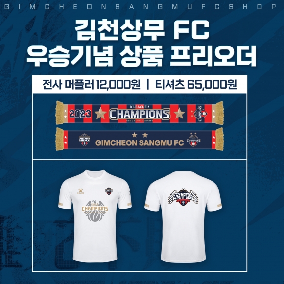 김천상무프로축구단이 12월 6일 오후 6시부터 9일 오후 6시까지 구단 공식 온라인 샵을 통해 ‘2023 우승 기념상품’ 프리오더를 실시한다. ‘2023 우승 기념상품’은 김천상무가 ‘하나원큐 K리그2 2023’ 우승을 거머쥔 것을 기념해 제작했다. 우승기념 엠블럼은 인플라톤에서 제작했다.