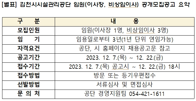 세부 자격요건 등 상세내용은 채용공고문을 통해 확인하면 된다. 채용공고는 공단, 김천시 홈페이지 및 지방공기업 경영정보포털(클린아이)을 통해 12월 7일(목)부터 12월 22일(금)까지 게시되며, 응시원서 접수는 12월 7일(목)부터 12월 22일(금) 오후 6시까지 방문·등기우편을 통해 접수 가능하다. 우편 접수의 경우, 접수마감일 오후 6시까지 도착분에 한해 유효하다. 김천시시설관리공단 임원추천위원회 주관으로 진행되는 임원채용 전형은 1차 서류심사(절대평가), 2차 면접심사(상대평가) 등의 절차로 진행되며, 전형이 완료되면 임원추천위원회에서는 2배수 이상의 임원 후보자를 김천시장에게 추천할 예정이다. 전형 단계별 합격자는 홈페이지 게시와 함께 개별 통보되며, 도덕·윤리성 검증(퇴직공직자 및 비위면직자 등 취업제한 심사 포함)을 완료한 적격자 중 김천시장이 합격자를 최종 임명할 예정이다. 채용과 관련된 기타 문의사항은 김천시 시설관리공단 경영지원팀으로 문의하면 된다.