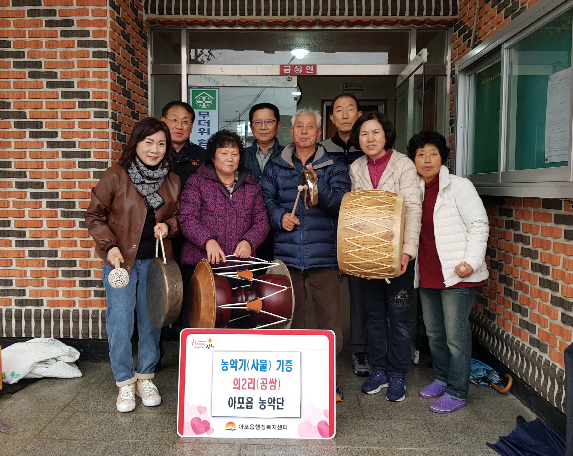 | 아포읍 농악단(단장 신도근)은 지난 12월 11일 아포읍 의2리 공쌍마을(이장 정재건)에 120만 원 상당의 농악기 4종(북, 장구, 징, 꽹과리)을 기증했다.