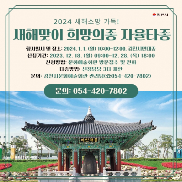 자율 타종을 희망하는 시민은 오는 18일부터 김천시 문화예술회관에 직접 방문하거나 전화(☎ 420-7802)로 신청하면 되며, 사전에 신청하지 못한 경우 당일 현장 접수도 가능하다.