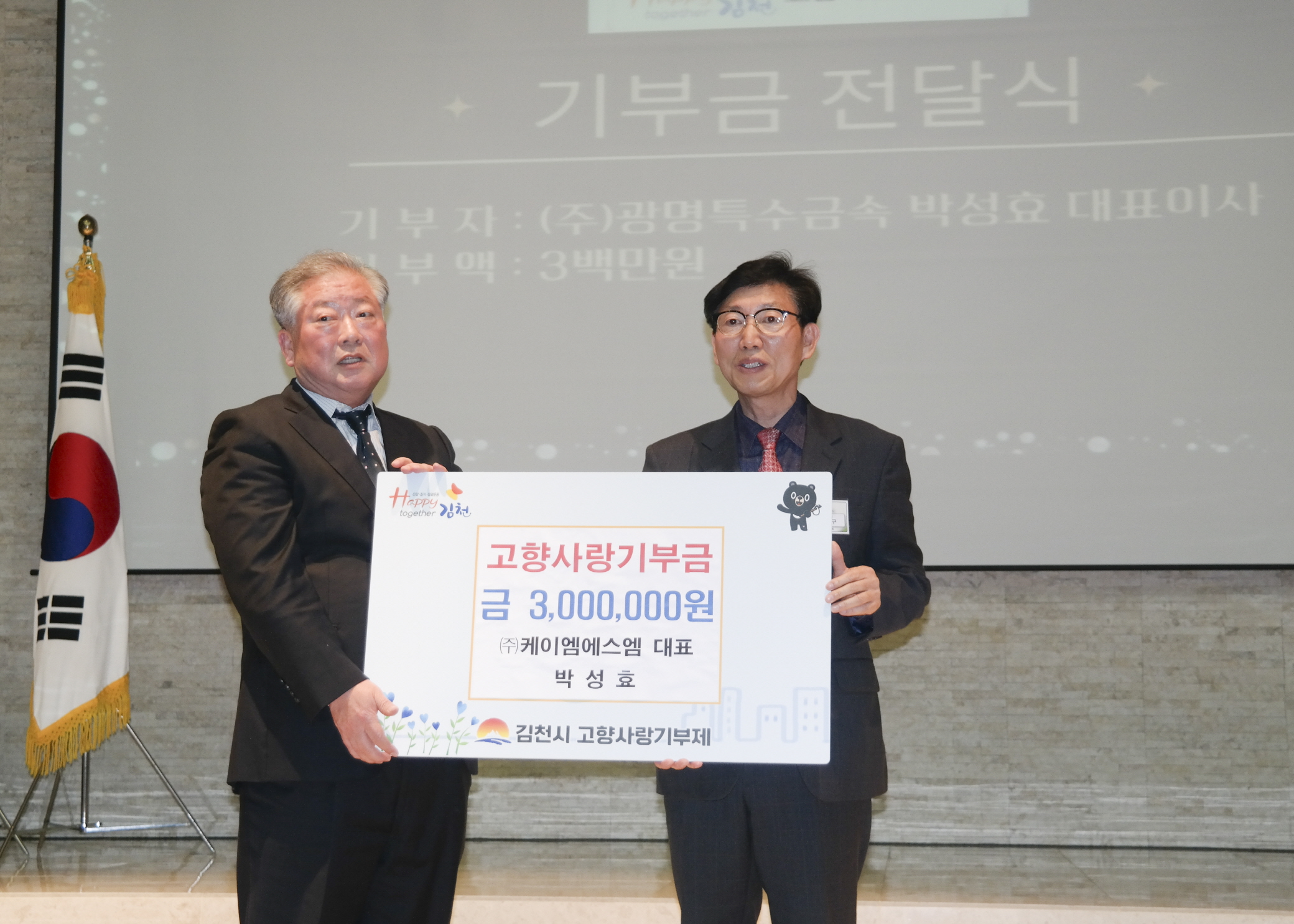 | 김천시는 ㈜광명특수금속 박성효 대표가 고향 사랑 기부금 300만 원을 맡겼다고 12월 18일 밝혔다.