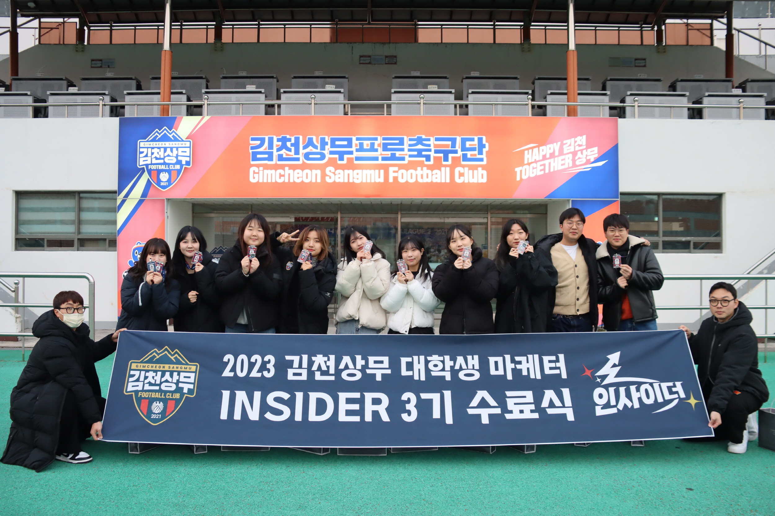 인사이더 3기는 2023시즌 동안 김천상무의 구성원으로서 함께 했다. 경기운영팀은 홈경기 진행 보조, MD샵 운영, 이벤트 진행 등 경기장 안팎으로 다양한 활동을 했다. 콘텐츠팀은 사진 촬영, 취재 기사 작성뿐만 아니라, 원정 포스터 제작, ‘응답하라, 김천상무’ 영상 기획 및 제작을 통해 콘텐츠 양산에 힘을 보탰다.