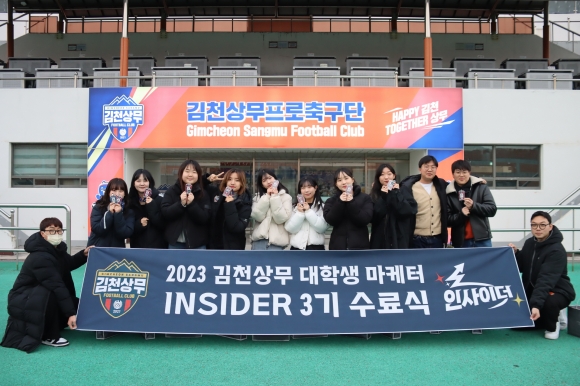 | 김천상무프로축구단(대표이사 배낙호)이 지난 12월 19일 김천상무프로축구단 미디어룸에서 ‘대학생 마케터 인사이더 3기 수료식’을 진행했다. 수료식에는 김천상무 배낙호 대표이사를 비롯해 인사이더 3기가 참석했다.