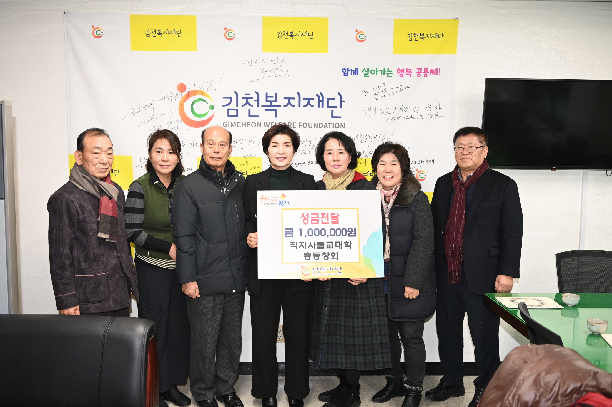 이번 성금은 회원들이 연말연시 어려운 이웃과 온기를 나누고자 십시일반 마련했으며, 직지사 김천 불교 대학 총동창회는 올해 4월에도 200만 원 상당의 의류를 김천복지재단에 맡기는 등 다양한 봉사활동을 통해 이웃사랑을 실천하고 있다.