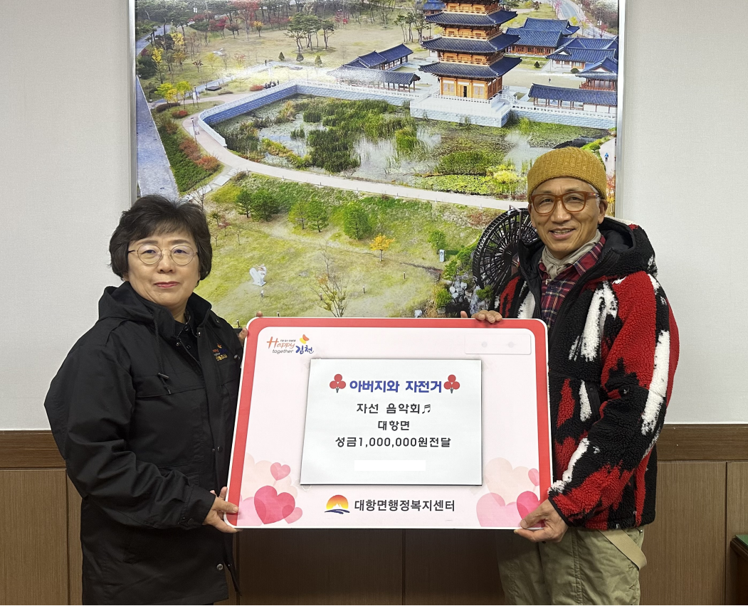 | 12월 21일, 대항면(면장 최정숙)에 있는 카페‘아버지와 자전거’에서는 제5회 자선 음악회를 통해 얻은 수익금 1백만원을 '희망 2024 나눔 캠페인' 기금으로 대항면에 기탁했다.