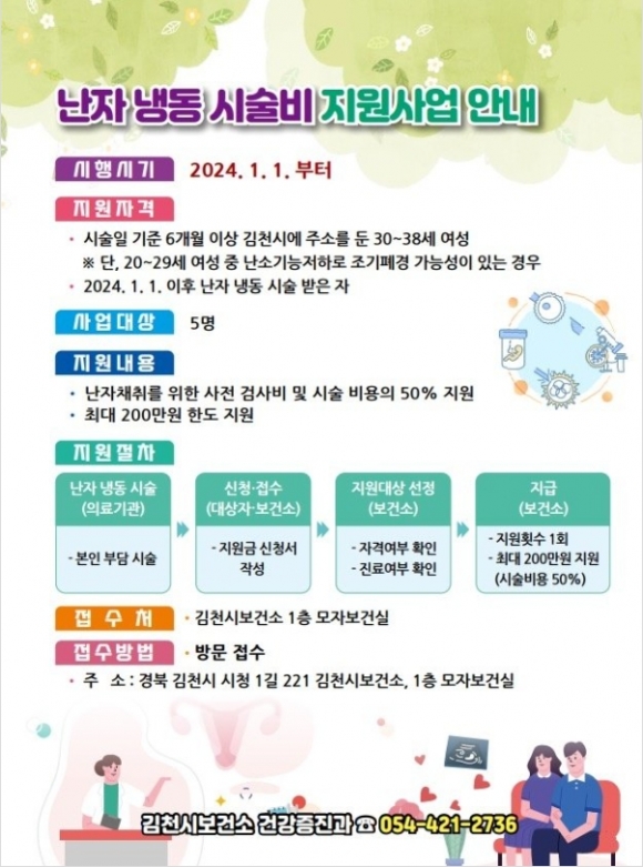 | 김천시 보건소는 우리나라 평균 결혼 연령과 출산 연령이 높아짐에 따라 난임 발생 가능성이 증가하는 등 임신, 출산의 어려움이 커지고 있어, 출산 전 단계에 대한 지원을 강화하고자 2024년 1월 1일부터 난자 냉동 시술비 지원사업을 새롭게 시행한다.