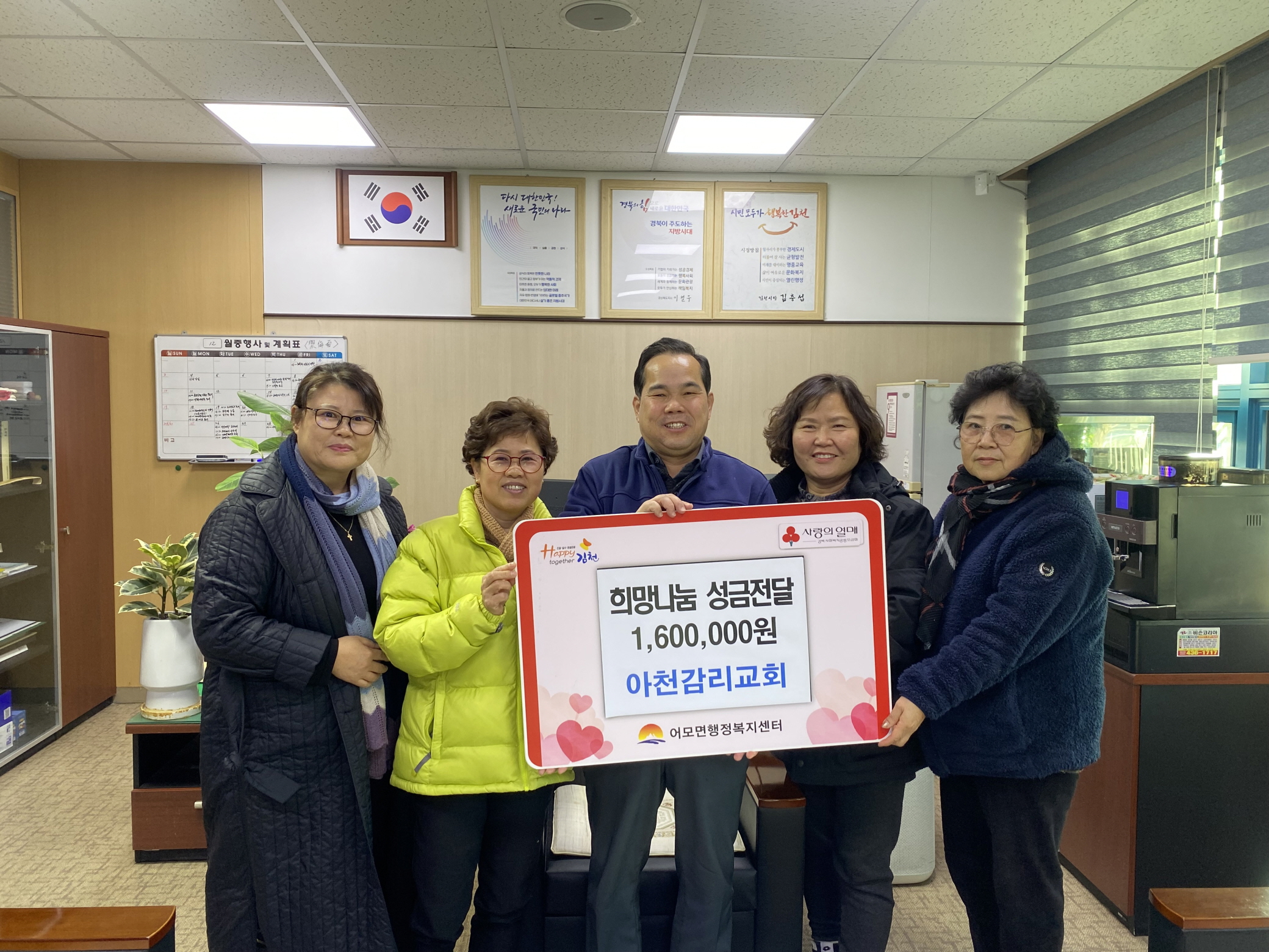 | 어모면 아천감리교회와 남산 식품에서는 연말을 맞이하여 12월 21일 어모면 행정복지센터를 방문하여 어려운 이웃을 위한 260만 원을 기탁했다.