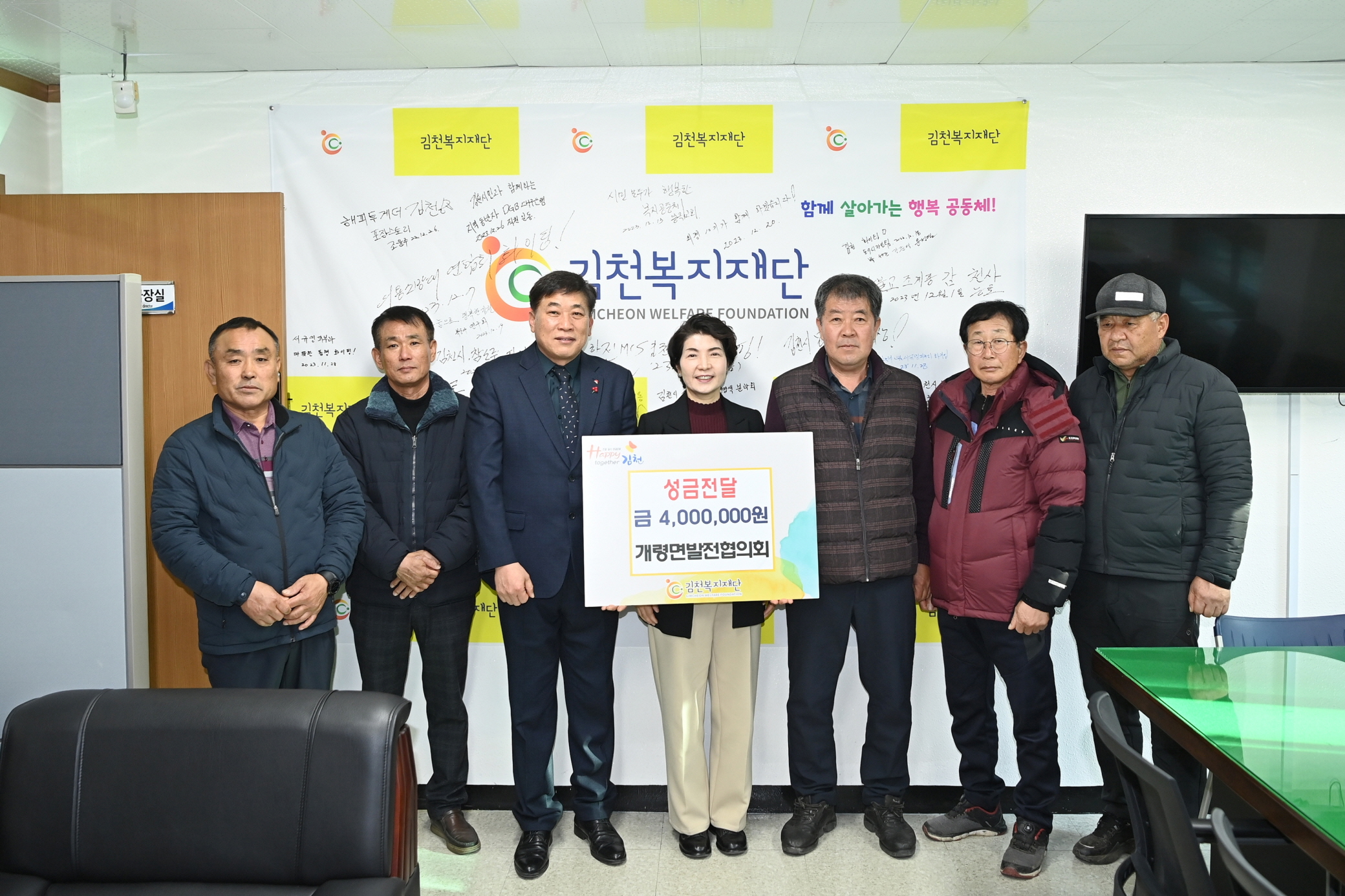 | 김천복지재단은 지난 12월 26일 개령면 발전협의회(위원장 안진규)로부터 이웃돕기 성금 400만 원을 전달받았다고 밝혔다.